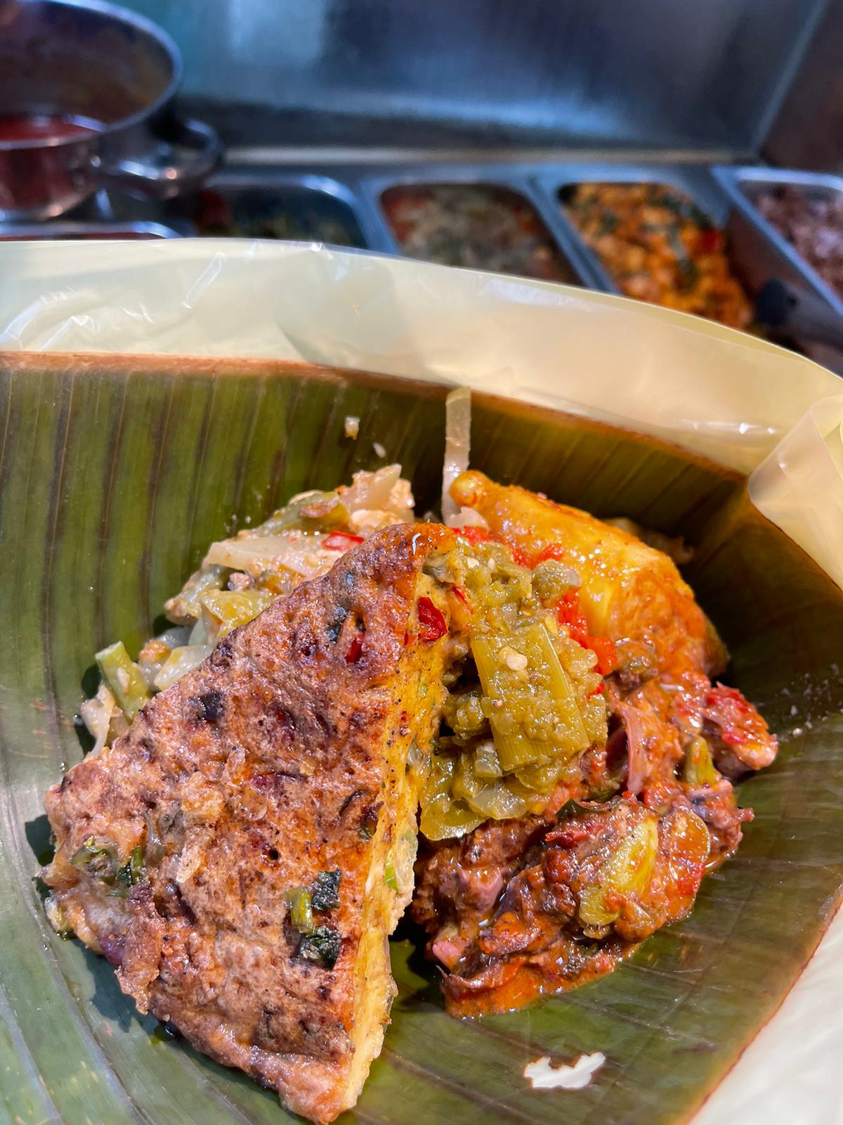 First visit. Was encouraged by my wife to give a try to this place, came around lunch time and was waiting around 10 mins. Also it was the only shop selling heavy meal within walking distance with many offices surrounding. It was because the style of pick and choose the dish for meal which could take time especially for newcomers. I chose meatball and iced lemon tea for kid and mixed meal including fried chicken, corn fritters and 10 veggies dish. I would give 9 (near perfect) for food especially the variety and taste. The sambal wasnt too bad, could be more spicy tho. The service and the atmosphere were 6 (ok) as the seatings were many, peak time during lunch time and added with multi tasking single fighter waiter, it took sometime to clean up the used tables. Cutlery, drink and serviette were self service. There was toilet outside the shop within the building. Also we took away food (mixed meal including rendang-it was great taste, lodeh-spicy according to my wife, and corn fitter), pukis cake topped with choc rice and cheese, and cendol and bird nest drink. Overall, it is wonderful thing to have new experience. Reccomended to try.